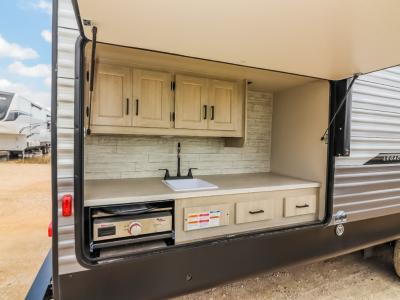 This trailer offers lots of floor space thanks to the triple slides throughout! You and your family will love the combined living and kitchen area with a slide out booth dinette and a sofa with drink holders. The L-shaped kitchen counter allows the cook to make meals without moving for anyone trying to get to the full bathroom and rear den. Here, you'll find a tri-fold hide-a-bed sofa slide, a wardrobe and a workstation if you need to telecommute. The front private bedroom allows you to sleep like royalty and offers a large closet for your clothing and another closet prepped for a washer/dryer.