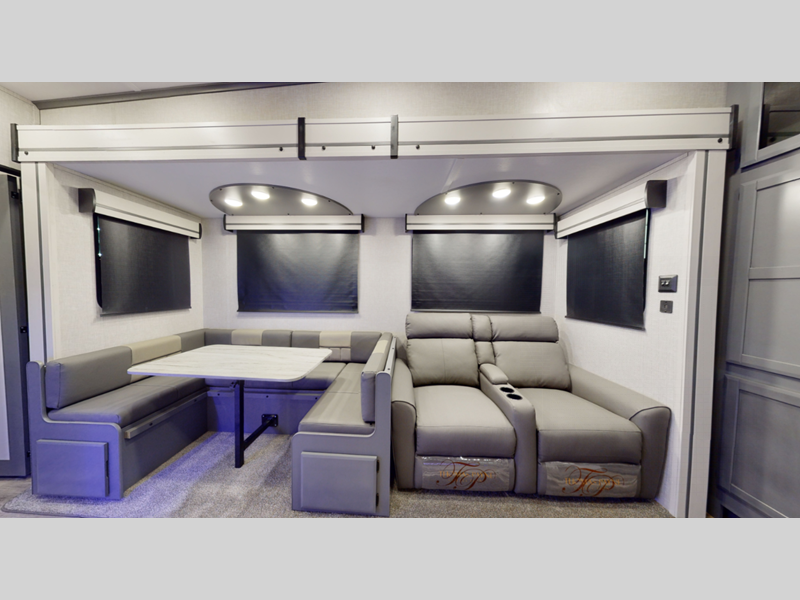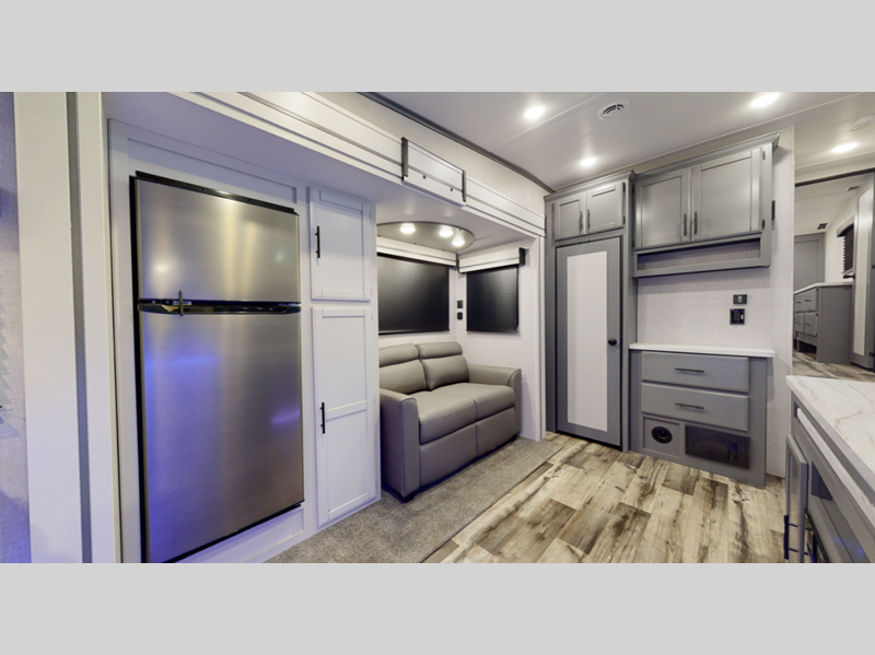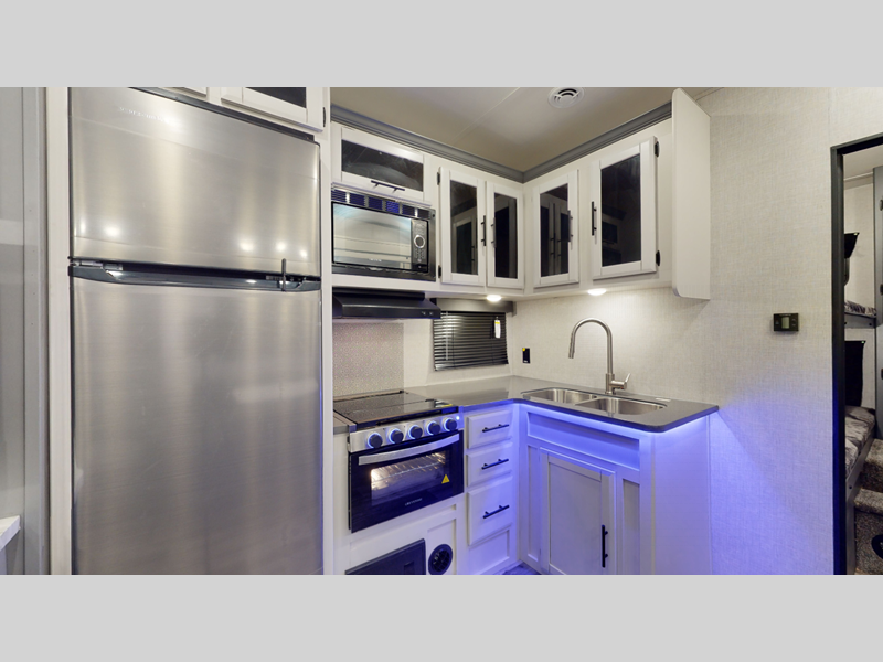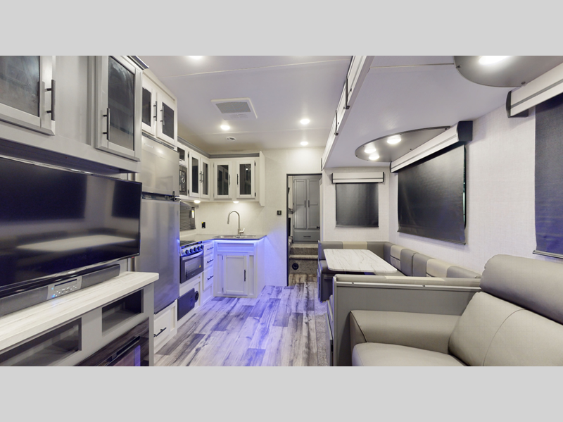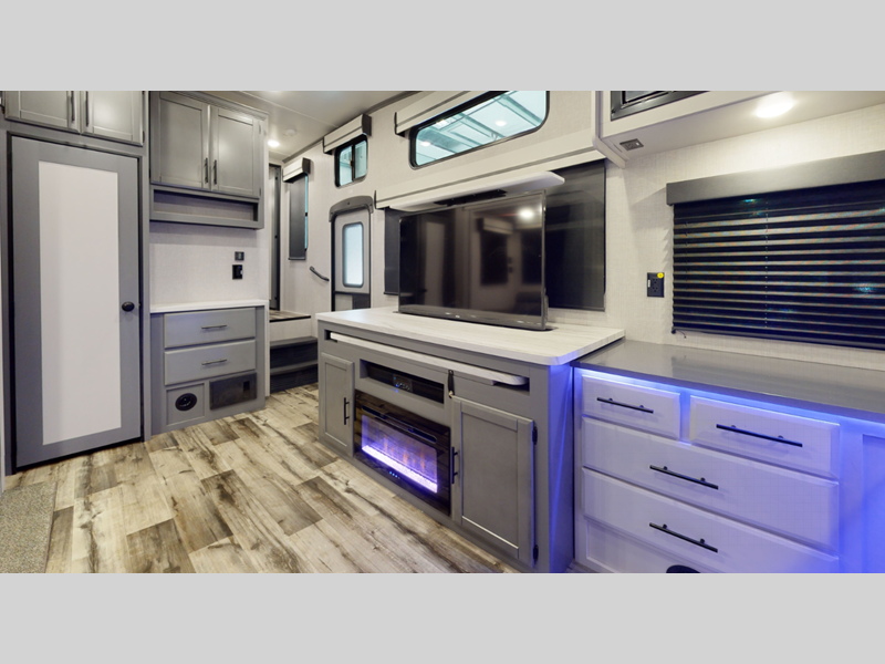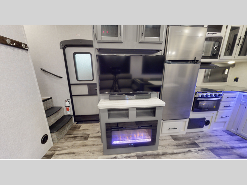 Each Volante is constructed with a fully enclosed and forced air heated underbelly that will extend your camping season, and you're going to love the sleek look of the fiberglass front cap. Power stabilizer jacks make setting up camp easier than ever, and there is a power awning with LED lights so you can relax under once everything is unloaded from the truck. Head inside to find stainless steel appliances, premium residential furniture, a cozy fireplace, and many more comforts of home.