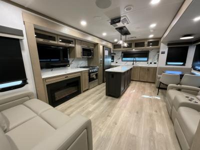 Sleeps 4 Slides 3 Length 36 ft 10 in Ext Width 8 ft Ext Height 11 ft 7 in Hitch Weight 1295 lbs Dry Weight 9474 lbs Cargo Capacity 1821 lbs Fresh Water Capacity 54 gals Grey Water Capacity 131 gals Black Water Capacity 53 gals Furnace BTU 35000 btu Available Beds King Refrigerator Type 12V Cooktop Burners 3 Number of Awnings 2 LP Tank Capacity 30 lbs Water Heater Capacity 6 gal Water Heater Type Gas/Electric Quick Recovery TV Info LR Smart TV Awning Info 11' and 17' Power w/Adjustable Rain Dump & LED Lights Axle Count 2 Washer/Dryer Available Yes Number of LP Tanks 2 Shower Type Shower w/Seat Electrical Service 50 amp Similar Travel Trailer Floorplans