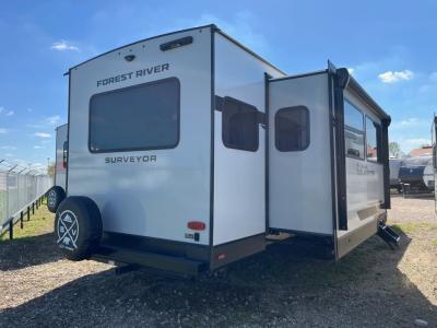 With any Grand Surveyor travel trailer by Forest River you will enjoy turn-key ready-to-go features and quality construction! Each model includes Azdel composite walls and a gel coated fiberglass front cap with an automotive style tinted windshield for a sleek look. There are friction hinge black glass entry door(s), an adjustable platform step with a night light, plus Goodyear tires and a power tongue jack for easy towing. The interior will have you feeling right at home with roller shades, residential faucets, sinks, and bathroom vanity, plus Surf(x) seamless countertops throughout. You can also plan for adventure with a 2" rear accessory and exterior spray port, and there are slam latch exterior baggage doors throughout to keep all your gear secure. Other stand-out features include a central vacuum system, a 200 watt solar panel with a 30 amp controller, a tankless water heater, carpet-free interiors, and the list goes on!