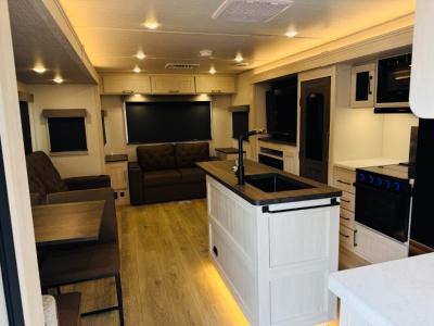 If luxury is what you're looking for, you won't have to search far with this travel trailer! There are triple slides, with dual opposing slides in the main living area for maximum space. The kitchen island gives a more residential feel to this space, plus there is a pantry, a hutch with shelves, a 10 cu. ft. 12V black glass refrigerator, and more kitchen features you are sure to love. The rear living area includes a EZ-out sofa to provide sleeping space for two overnight guests, and there is a theater seat across from the fireplace and HD TV. You'll also enjoy dining at the free-standing dinette with a multi-purpose ottoman! When it's time to call it a night, you can clean up in the spacious full bath, then head to the front master bedroom to retire. There is a custom king bed slide out here, along with a full-wall wardrobe in front, a dresser, a closet with washer and dryer prep, plus a bedroom fireplace!