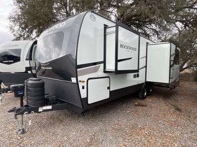 Each Rockwood Ultra Lite travel trailer by Forest River includes superior construction with a high gloss fiberglass cap, aluminum cage construction, and a power awning with LED lighting for a cozy and functional outdoor space. The torsion axle, power tongue jack will make towing smooth and hassle-free, along with the nitrogen filled, Goodyear Endurance tires and the tire pressure monitor system. Interior comforts include  kitchen sink with high rise faucet, hidden hinge cabinet doors, and roller shades to name a few. Choose a Rockwood Ultra Lite travel trailer today!