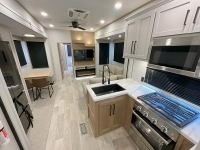 This Sierra fifth wheel is thoughtfully designed for comfort and convenience, starting with a spacious front bunkhouse perfect for accommodating guests. It features two flip-up bunks, 28" x 74" and 32" x 74" and a 60" x 74" fold-out lounge, along with a wardrobe, dresser, and additional storage to keep essentials organized. A nearby half bath adds easy access and extra convenience. At the center of the unit, the kitchen offers everything you need to prepare meals, including a stainless-steel sink, three-burner cooktop, and a generous 16 cu. ft. refrigerator. Meals can be enjoyed at the free-standing dinette, or you can unwind on the sectional sofa while enjoying the fireplace or entertainment center. At the rear, you'll find the private main bedroom with a roomy 66" x 80" RV king bed, plus its own wardrobe and dresser. Just steps away is the full bathroom featuring a one-piece fiberglass shower, sink with medicine cabinet, linen storage, and even washer/dryer prep for extended stays.