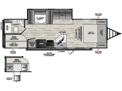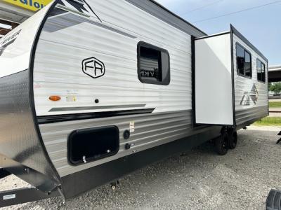 Pack your bags and head to the campground in this spacious travel trailer for the whole gang! The owners will love having their own space in the front private bedroom, complete with an RV queen bed and dual wardrobes and shelves. There are double-size bunks in the rear corner, with the full bath in the other rear corner for easy nighttime use. Everyone can meet in the combined living area and kitchen while the cook makes breakfast. There is a sofa and dinette within the large slide out and an entertainment center with an optional fireplace if you want to make this space more cozy. This unit also includes a large pantry with washer and dryer prep, giving you the option to add these appliances, and an optional camp kitchen can be added for the cook who loves being outdoors!