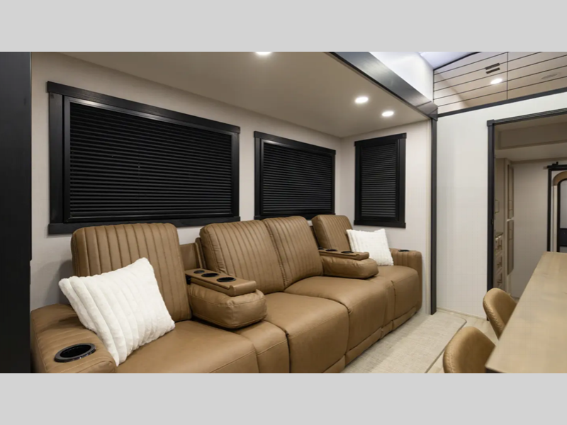 Sleeps 7 Slides 5 Length 43 ft 9 in Ext Width 8 ft 5 in Ext Height 13 ft 5 in Int Height 6 ft 8 in Hitch Weight 2830 lbs Dry Weight 15044 lbs Cargo Capacity 2951 lbs Fresh Water Capacity 57 gals Grey Water Capacity 53 gals Black Water Capacity 59 gals Available Beds Custom King Refrigerator Type 12V Refrigerator Size 20 cu ft Cooktop Burners 4 Number of Awnings 1 Water Heater Type On Demand Tankless AC BTU 45000 btu TV Info LR 65" LED Smart TV Awning Info 20' with LED Lights Axle Count 2 Washer/Dryer Available Yes Shower Type Shower w/Seat Similar Floorplans