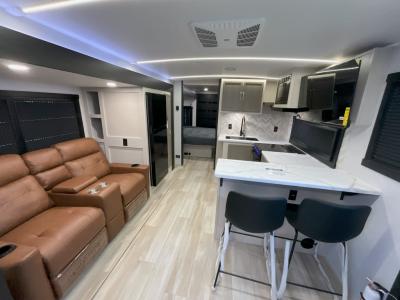 Sleeps 2 Slides 2 Length 33 ft 2 in Ext Width 8 ft Ext Height 11 ft Hitch Weight 880 lbs Dry Weight 7858 lbs Cargo Capacity 1822 lbs Fresh Water Capacity 49 gals Grey Water Capacity 78 gals Black Water Capacity 30 gals Available Beds King Refrigerator Type 12V Refrigerator Size 10 cu ft Cooktop Burners 3 Number of Awnings 1 Water Heater Type On Demand Tankless AC BTU 18000 btu TV Info LR 40" LED Smart TV Awning Info 21' with LED Lights Axle Count 2 Washer/Dryer Available Yes Shower Type Walk-In Shower Electrical Service 50 amp Similar Travel Trailer Floorplans
