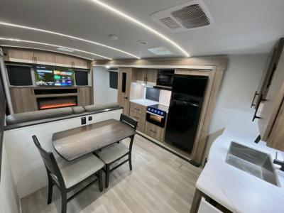 The rear living room on this Imagine travel trailer is just what you'll want when you're looking for a little down time. This room has opposing tri-fold sofas within slides, theater seating, and a TV. Another place that you can sit down at is the free-standing adjustable dinette. You can sit here with a fresh cup of coffee in the afternoon as you map out your hike for tomorrow. The kitchen offers you a flip-up countertop extension, a microwave, a three-burner range with oven, a 10-cubic foot 12V refrigerator, and pantry to help you make meals, and there is a private bedroom with a 60" x 80" bed to rest on at the end of the day.