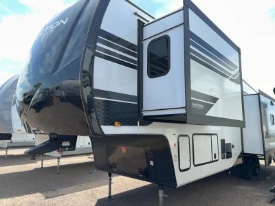 You can enjoy a spacious rear living area in this RV with dual opposing slides offering you entertainment, kitchen amenities, seating and windows for great views! The rear tri-fold sofa also converts into extra sleeping space for an extra guest or two, just like the booth dinette does. Yet you might like to add the swivel dinette option. There are theater seats to enjoy while you place your drinks in the cupholders and watch the entertainment center with a 40" LED HDTV and fireplace. The pantry is big enough to store your favorite snacks, and the kitchen island will make meal prepping easier, plus there is a 16 cu. ft. refrigerator to store any leftovers. The full bathroom has a 30" x 48" fiberglass shower and a linen closet to store your towels. The front private bedroom has a comfortable queen bed slide that can be switched out for the optional king bed, a dresser with overhead cabinets, and a full wall wardrobe that is prepped to add the optional washer and dryer so that you can extend your camping trip with clean clothes!