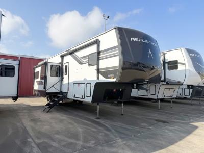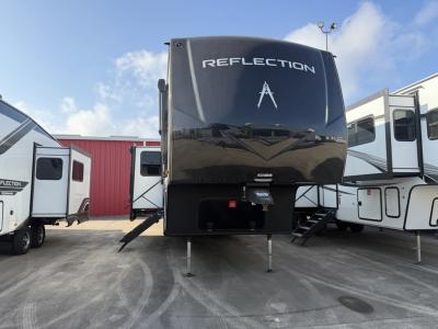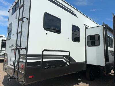 With any Reflection fifth wheel by Grand Design, you will have a solar panel for off-grid camping and a 60 amp charge controller and inverter prep, a Universal All-In-One docking station, unobstructed pass-through storage, and Goodyear Endurance tires. Each is constructed of gel coat exterior sidewalls, residential 5" truss rafters, walk-on roof decking, a fiberglass and radiant foil roof and front cap insulation plus laminated aluminum framed side walls, roof and end walls in slide rooms. Head inside to enjoy residential hardwood cabinet doors, premium Congoleum flooring, a spacious shower with a glass door, and many more comforts!