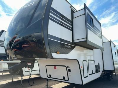 Sleeps 7 Slides 4 Length 39 ft 11 in Ext Width 8 ft Ext Height 12 ft 8 in Hitch Weight 2400 lbs GVWR 14995 lbs Dry Weight 12500 lbs Fresh Water Capacity 74 gals Grey Water Capacity 79 gals Black Water Capacity 79 gals Tire Size ST235/85R16LRE Furnace BTU 35000 btu Number Of Bunks 1 Available Beds Queen Refrigerator Type 12V Refrigerator Size 16 cu ft Cooktop Burners 3 Number of Awnings 2 LP Tank Capacity 30 lbs Water Heater Type On Demand Tankless AC BTU 15000 btu TV Info LR 40" TV Awning Info 13' & 10'6" One-Touch Electric LED Axle Count 2 Number of LP Tanks 2 Shower Type Radius Electrical Service 50 amp Similar Fifth Wheel Floorplans