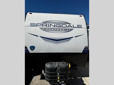 With any Springdale travel trailer by Keystone you will enjoy convenient amenities and comfortable camping features at every turn. The aluminum exterior will be easy to clean, and the power awning provides protection against the hot summer sun. There is also an exterior shower, a walkable roof, and an XL entry assist handle to safely enter and exit the unit. You will find many comforts inside, including a stainless steel sink, ample storage space for your belongings, and cozy sleeping spaces. Start a new adventure today in a Springdale travel trailer!