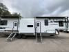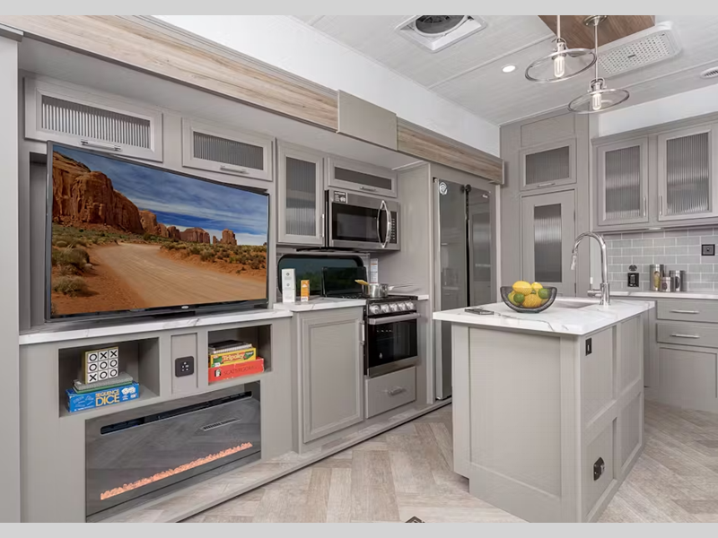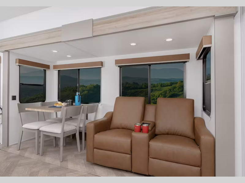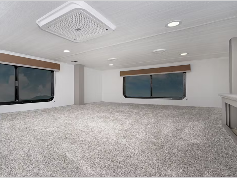 You will find Congoleum vinyl flooring with one-piece Dyna Span marine grade decking, residential style screwed and glued cabinetry, and designer upholstered window valances to make you feel right at home. The MaxTurn technology with Road Armor will make for smooth towing and the automotive-grade painted fiberglass front cap includes KeyShield protection for added convenience.