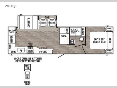 Pick your favorite camping spot and hitch this travel trailer up for a great weekend getaway! The rear kitchen has a three burner cooktop to prepare your best meals, an 11 cu. ft. stainless steel refrigerator to keep your perishables fresh, and a walk-in pantry for your canned goods and snacks for movie night. After a fun day at the beach, you can play a card game at the booth dinette, relax in either one of the two recliners and sofa, or rinse the sand out of your hair in the 32" x 40" shower with a seat in the full bathroom. There is also a front private bedroom with a queen bed to lay your head on at night, and dual shirt closets to keep your clothes tidy! Don't overlook the optional outside micro kitchen with a griddle!
