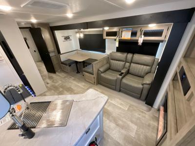 The whole family will love camping in this travel trailer! The kids will have their own privacy with the rear private bunkhouse which has a 32" x 69" bunk above a jiffy sofa slide and a 38" x 76" bunk above an entertainment center to keep them occupied on those rainy days. And you will have your own privacy with the front private bedroom that has a queen bed slide across from a dresser and a front closet. There is even a second closet with washer and dryer prep if you choose to add those appliances. Everyone can stay clean in the full bathroom with the 34" x 34" radius shower and their bellies full with the full kitchen. And you can choose between two outside kitchen options for even more convenience!