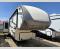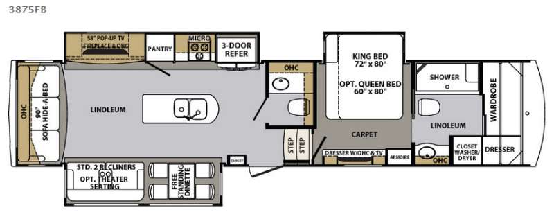 To the left of the entrance there is a convenient closet which can be used to hold coats. The first slide has a free-standing dinette or you can choose an optional booth dinette, and two recliners or you can choose optional theater seats. On the opposite side of the fifth wheel the second slide has a 58" pop-up TV with a fireplace below the TV, pantry, microwave, three burner range, and three door refrigerator. Along the rear of the living area there is a 90" sofa hide-a-bed, and in the middle of the kitchen you will enjoy the island which has a double kitchen sink.