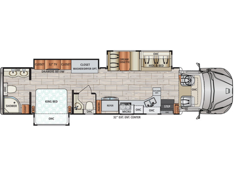 Been daydreaming about traveling the countryside but you don't want to leave any amenities at home. From a full kitchen with a 22 cu. ft. residential refrigerator to a closet prepped for a washer and dryer, there are several features you will love about this coach. The Dream dinette and hide-a-bed sofa slide out even offer extra sleeping space. Just imagine enjoying the great outdoors while watching the big game on the wall-mounted entertainment center with a 32" LED TV. You can get ready for bed in the rear master bath which includes his and her sinks, now that's luxury on wheels. And the half bath is handy when you invite overnight guests. There are many more features to see!