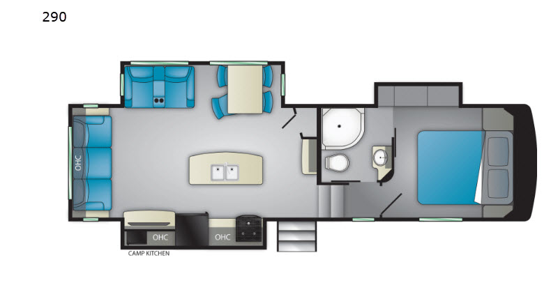 You will want to schedule a getaway every weekend when you own this Pioneer fifth wheel! The opposing slides in the central living area are what open up the space to make you feel comfortable as you prepare dinner around the kitchen island, and the 80" ceiling height will give you room to enjoy yourself without feeling cramped. You will find ample storage space for your belongings with the wardrobe slide in the master suite and the pantry in the kitchen.